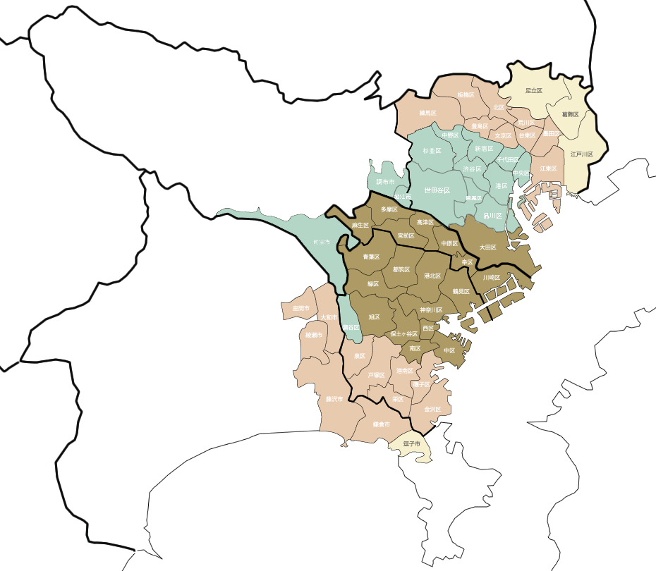 - 町田市、調布市、港区、杉並区、渋谷区、中央区、千代田区、新宿区、中野区、世田谷区、目黒区、品川区、狛江市